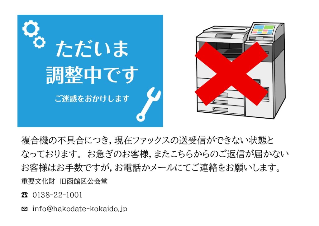 現在、機材の故障によりFAXの送受信ができない状況となっております。ご不便をおかけし誠に申し訳ございません。お急ぎのご連絡やご入館受付につきましては、下記のお電話またはメールにてご連絡いただきますようお願い申し上げます。また,ファックスをお送りいただいたにも関わらず,こちらからのご返信がまだ届いていないお客様も、お手数ですが再度お問合せ下さい。