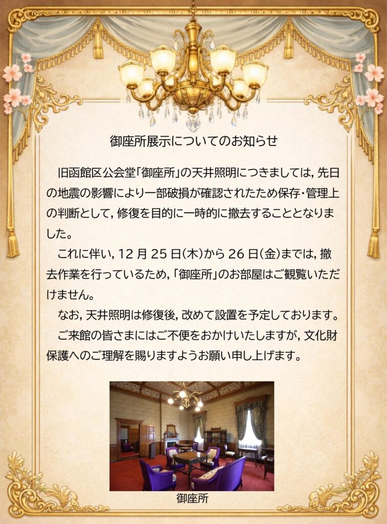 旧函館区公会堂「御座所」の天井照明につきましては,先日の地震の影響により一部破損が確認されたため保存・管理上の判断として,修復を目的に一時的に撤去することとなりました。