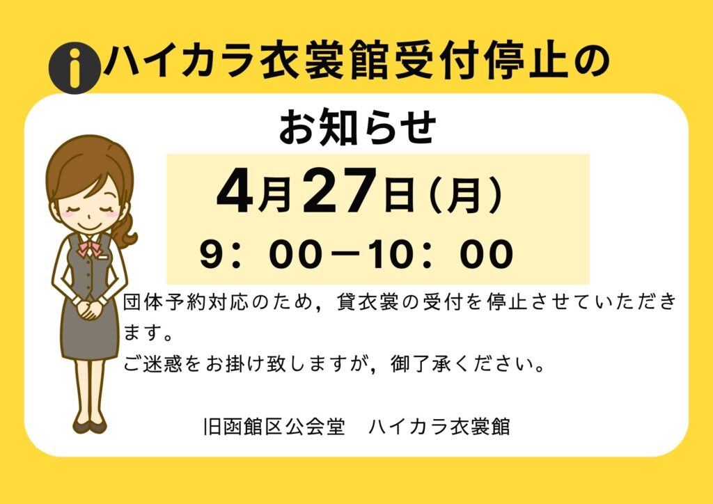 【令和8年4月27日(月)】ハイカラ衣裳館受付停止のお知らせ